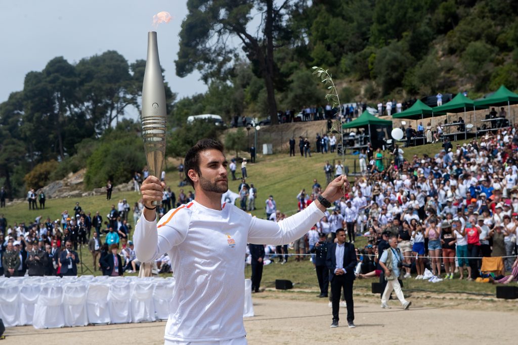 Bild från när årets OS-eld tändes i Olympia i april. Foto: Shutterstock