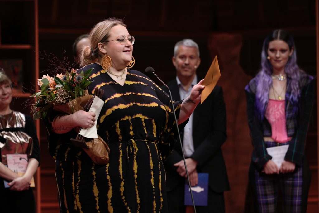 Ellen Strömberg tar emot sitt Augustpris för boken "Vi ska ju bara cykla förbi". Foto: Andreas Sundbom.